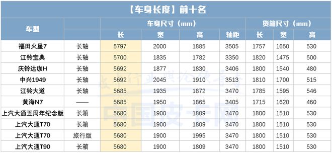 根据产品更新的基础上,我国皮卡网对国内皮卡商场在售的干流皮卡车型尺度进行了具体收拾,并对皮卡的长、宽、高、轴距以及货箱尺度等数据挑选了体现杰出的车型,让卡友能够更为直观地获取信息。